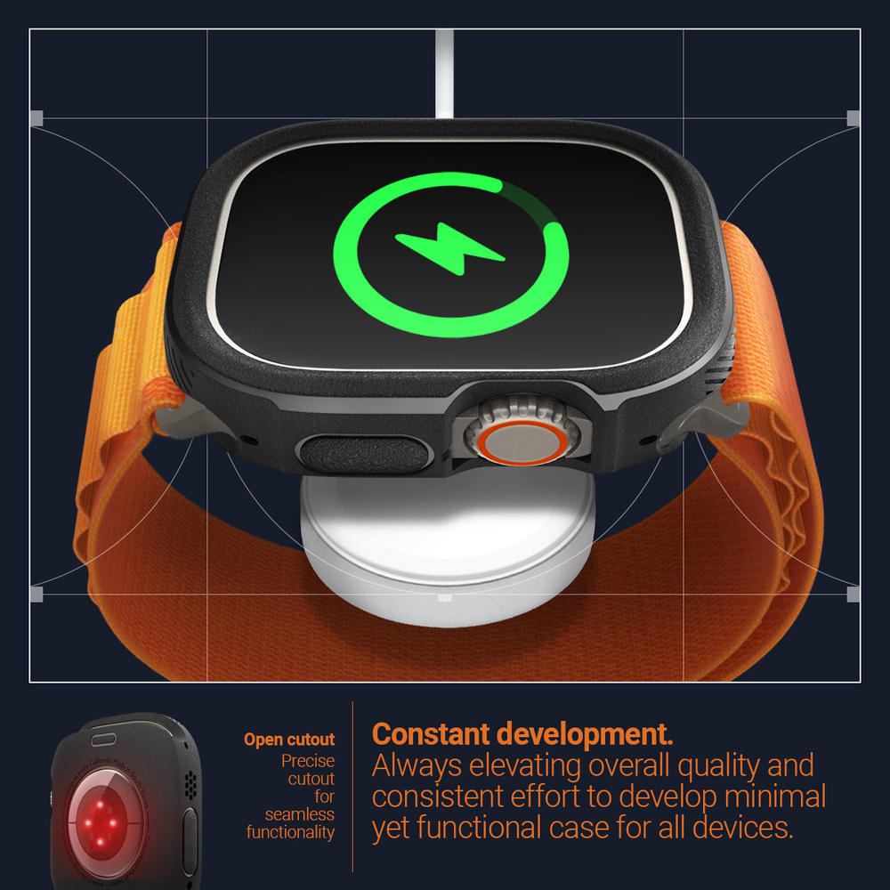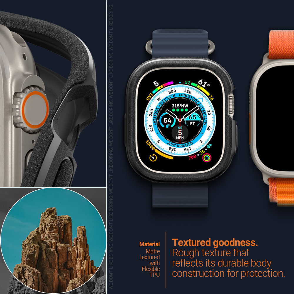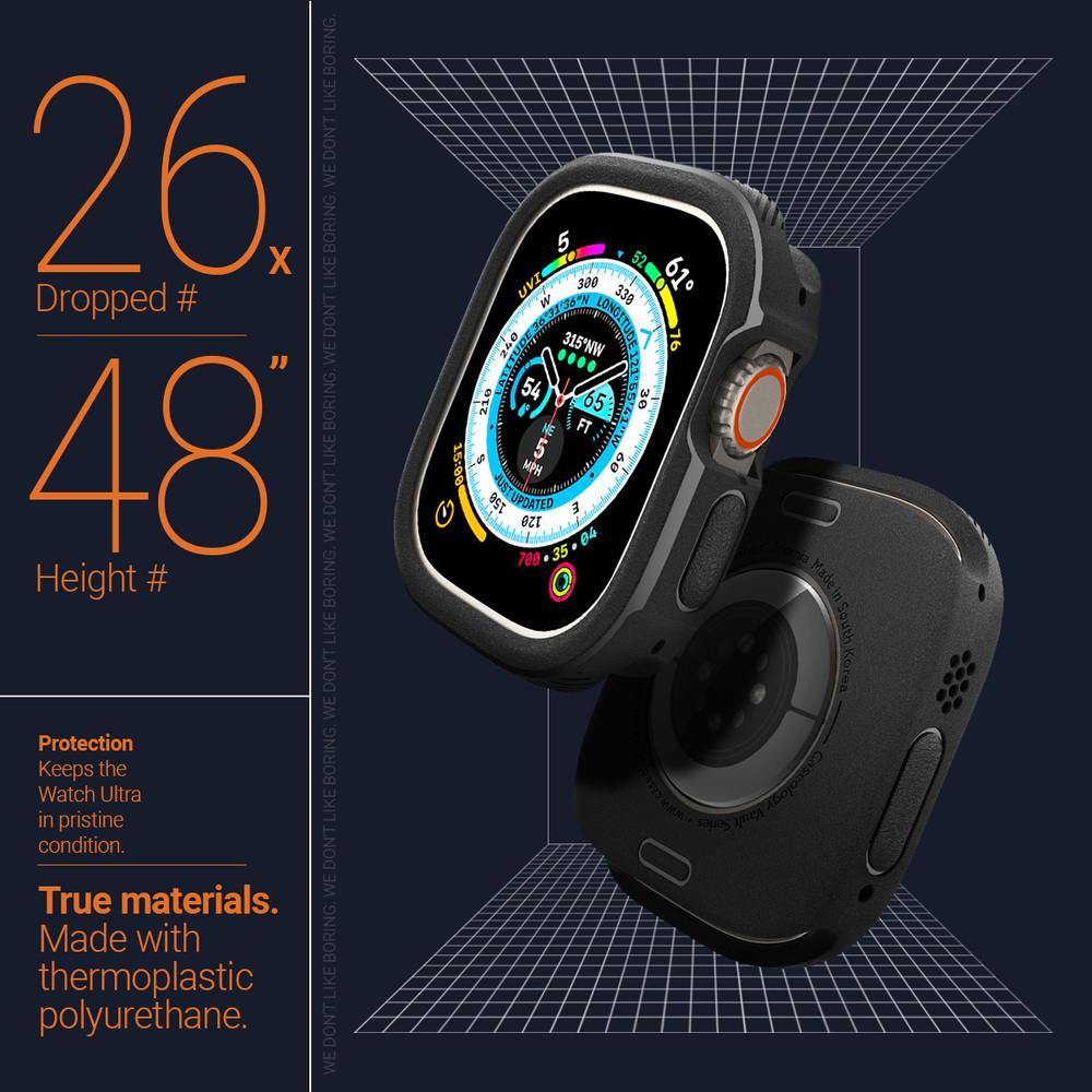 Meet Vault – now compatible with Apple Watch case. Vault is the ultimate reliable and rugged bodyguard for your Apple Watch Ultra 2/1 49mm. A durable layer of textured TPU armors your Apple Watch Ultra 2/1 49mm from everyday drops and tumbles, while providing excellent cover with slim and sleek feel. Vault packs heavy duty military grade protection and drop shock absorbing patterns into a deceptively slim profile, resulting in a case that can take whatever life throws at it. Our understated design features modern detailing around the camera cutout, creating a rugged exterior that never looks out of place.