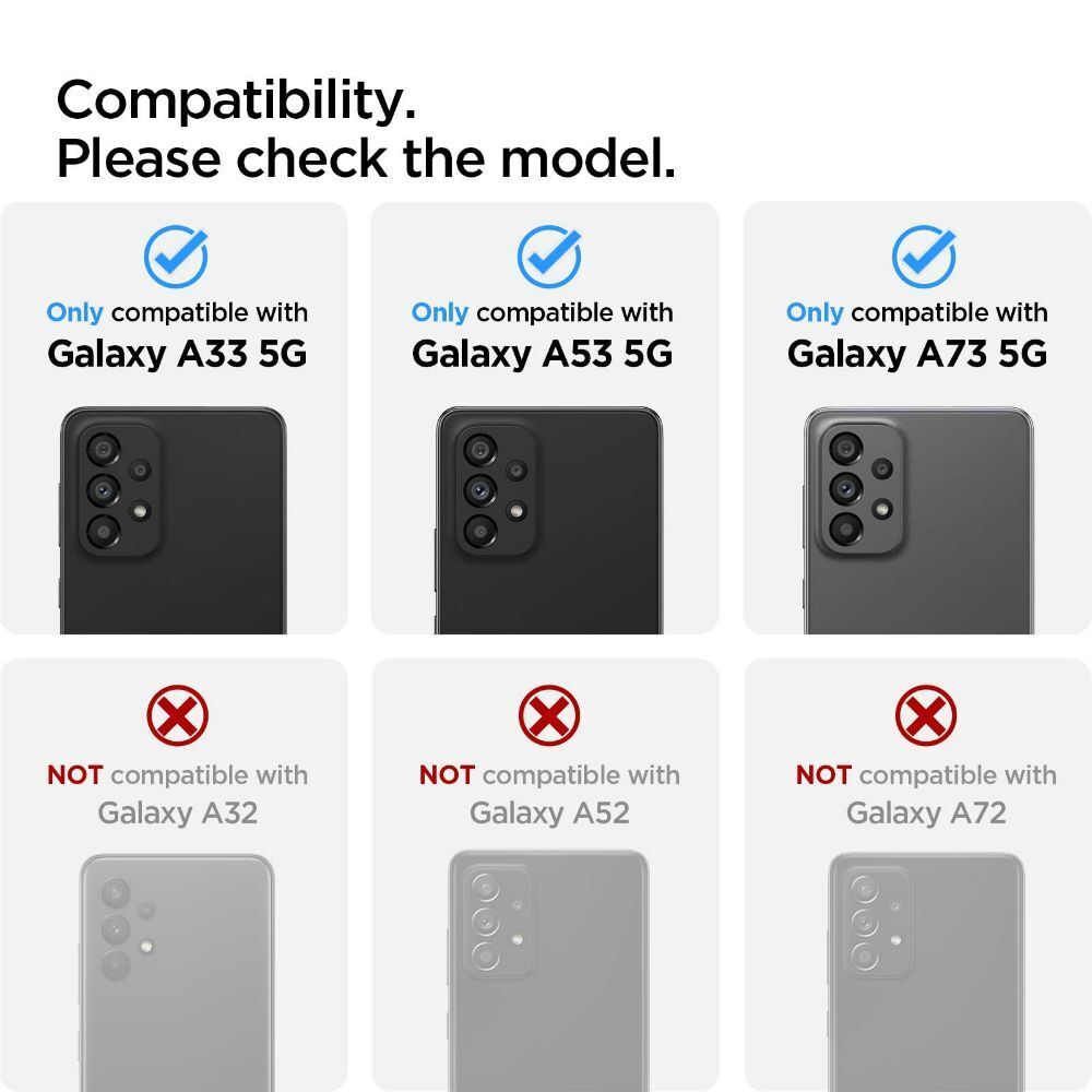 Look good, and stay safe - the newest improvement to the Galaxy A33/ A53/ A73 5G camera does exactly that. This screen protector lays over the cameras to allow for a clean and flat look while keeping your cameras scratch free. A simple and satisfying improvement for the perfectionist out there. * Compatible with all Spigen Galaxy A33/ A53/ A73 5G cases EXCEPT Spigen Tough Armor.