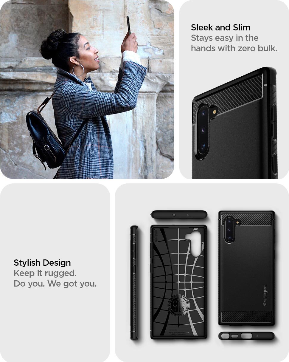 Inspired by car design, Rugged Armor® secures the Note 10 in a timeless and streamlined body. Its slim frame is textured with carbon fiber detailing and subtle glossy accents.