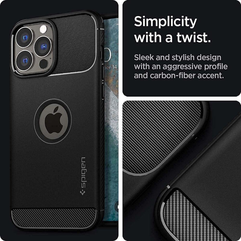 Inspired by car design, Rugged Armor® secures the iPhone 13 Pro Max in a timeless and streamlined body. Its slim frame is textured with carbon fiber detailing and subtle glossy accents.