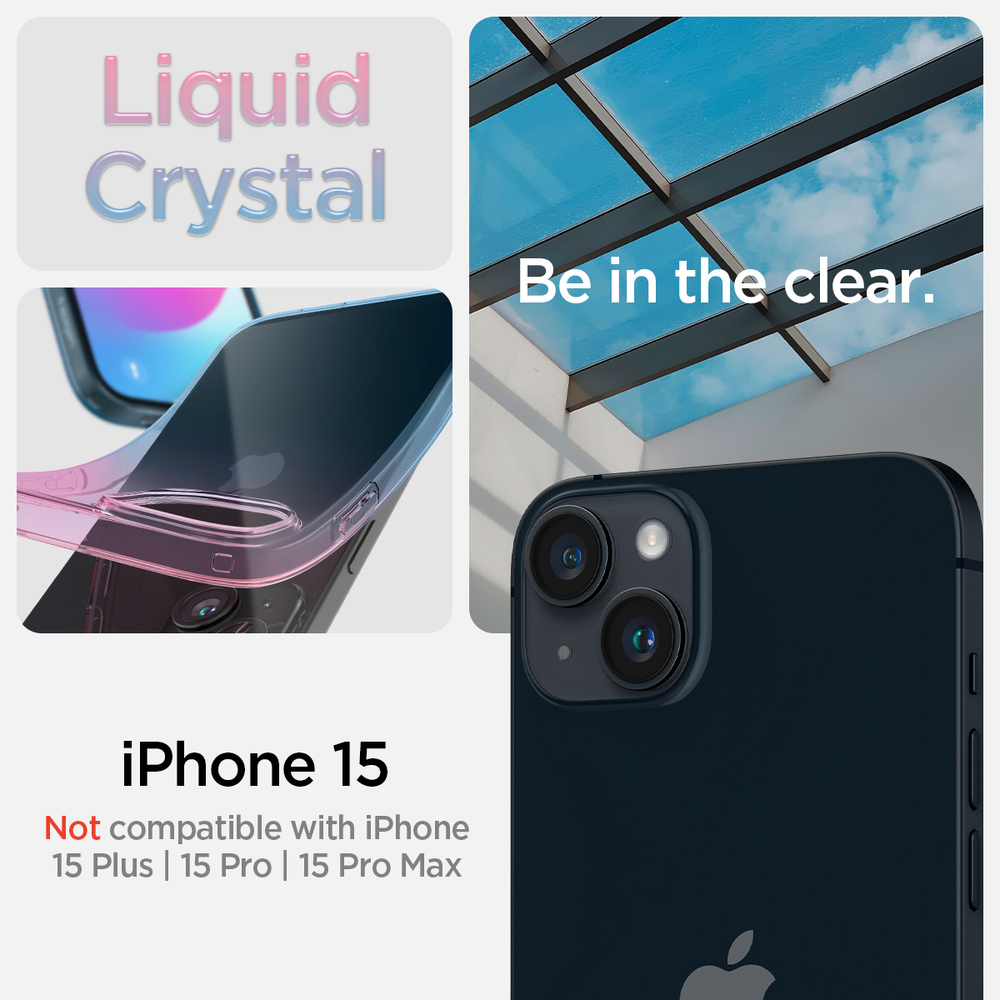 Stay in the clear. Liquid Crystal streamlines your iPhone 15’s far-out form. Whether streaming a movie or out and about, keep everyday dings and scratches away. Always behold the fluid design of your iPhone 15.