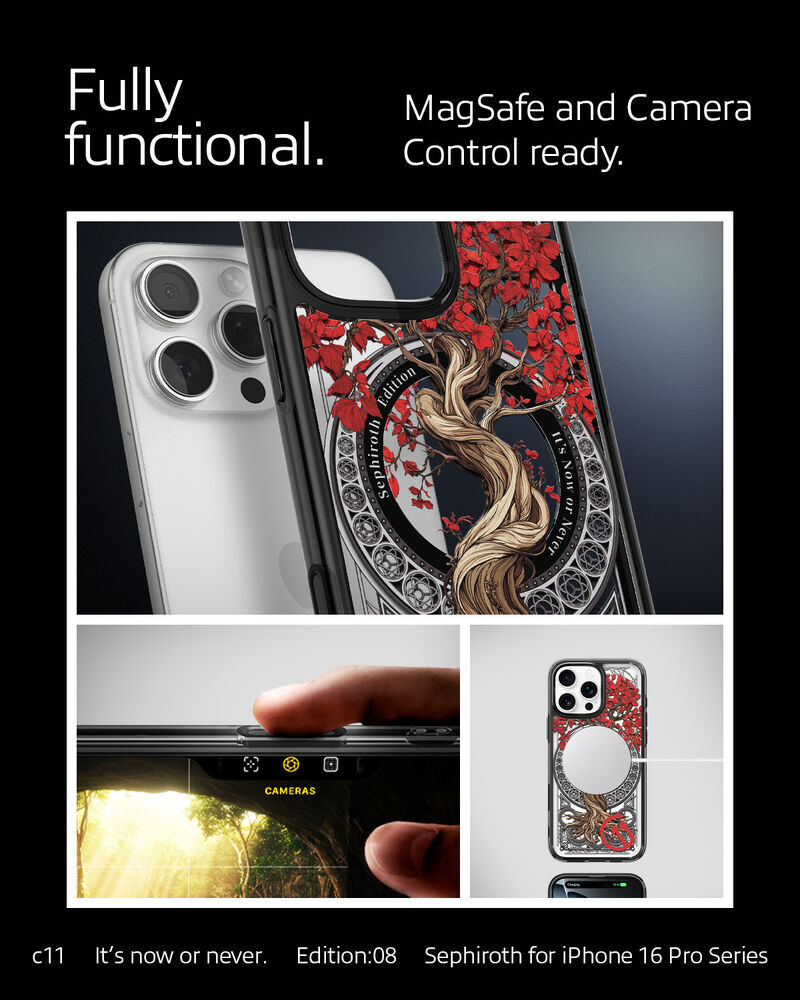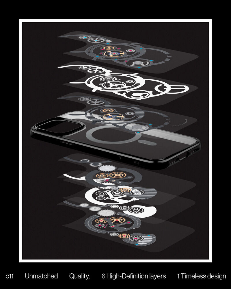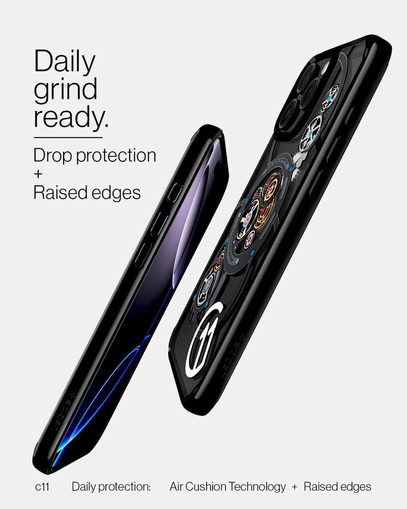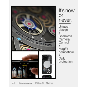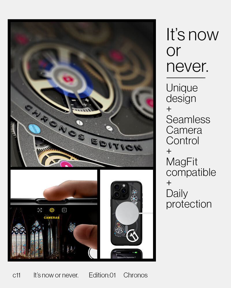 Time is of the essence. Gear up your iPhone 16 Series with the c11 Chronos. Capture the construct of time with in-depth clockwork for a sleek look every second. It's packed with MagFit for powerful MagSafe connection and topped off with the T Series button cover for seamless Camera Control. Add this limited timepiece to your collection before time runs out. *Device not included.