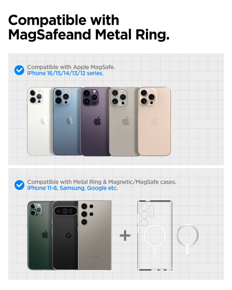 - Only compatible with the iPhone MagSafe series / Other Devices with MagSafe Case / Pixelsnap Case (When using a Case, use only with MagSafe Compatible Cases, MagSafe case is not included).