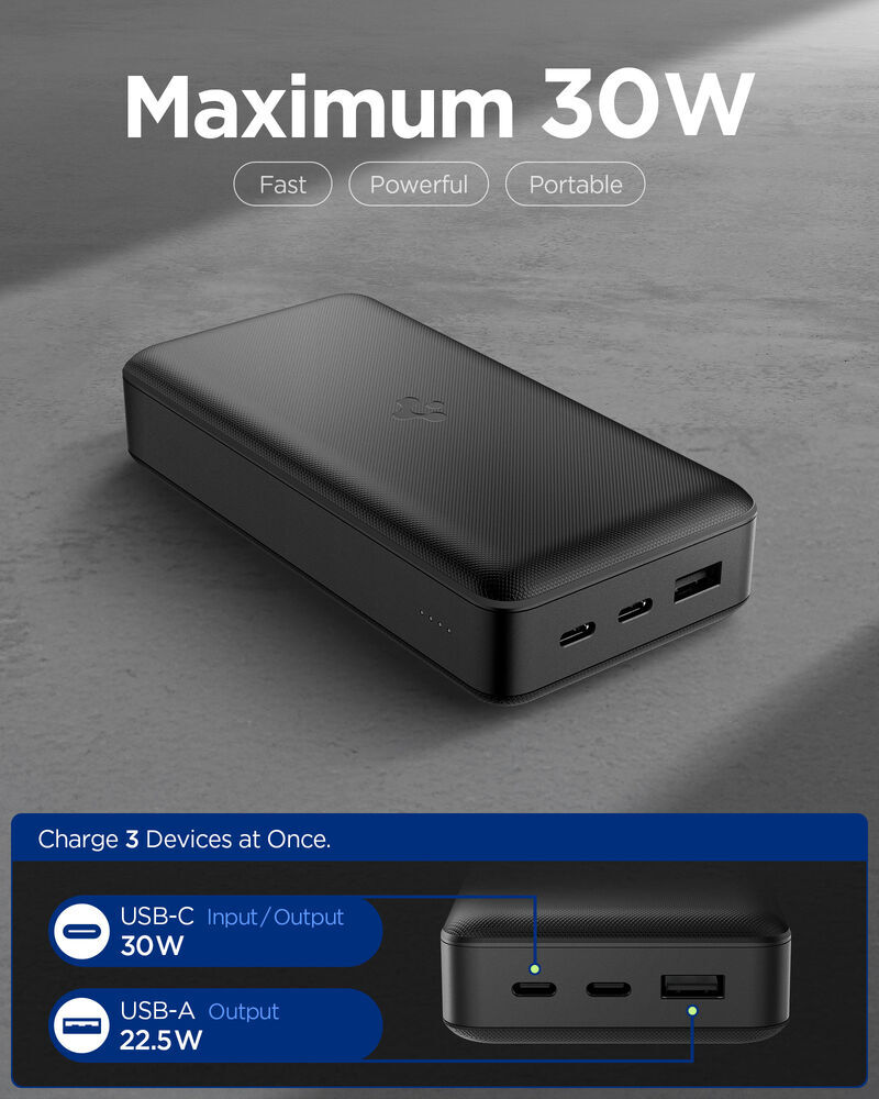 SPIGEN Essential QB USB-C USB-A 30000mAh 30W EA3030 3 Ports Power Bank for Universal [Colour:Black]